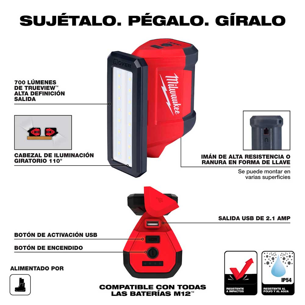 La linterna MILWAUKEE® M12™ ROVER™ de servicio y reparación con carga USB le ofrece una fuente de luz flexible para cualquier entorno y orientación. La luz proporciona 700 lúmenes de salida de alta definición TRUEVIEW™ y es capaz de iluminar un espacio de trabajo hasta 24 horas seguidas con una batería M12™ XC4.0Ah. Cuenta con un cabezal de luz que gira 120° para que pueda orientar la luz en múltiples direcciones. La luz de inundación compacta viene equipada con un fuerte imán orientado hacia atrás hecho para superficies de obra como montantes de acero, vigas en I y cajas de trabajo. La base aerodinámica de la luz le ofrece una opción de mano para la iluminación de inspección. El proyector LED recargable inalámbrico incluye un puerto USB de 2,1 amperios para cargar un teléfono o un dispositivo externo. El proyector ROVER™ cuenta con un orificio integrado para poder colgarlo en superficies no metálicas. Este proyector pivotante compacto tiene una clasificación IP54 de resistencia al polvo y al agua, tiene una lente resistente a los impactos que protege los LED y puede resistir caídas de hasta 9 pies. Los proyectores MILWAUKEE® ROVER™ están fabricados para ir a cualquier parte y resistirlo todo.