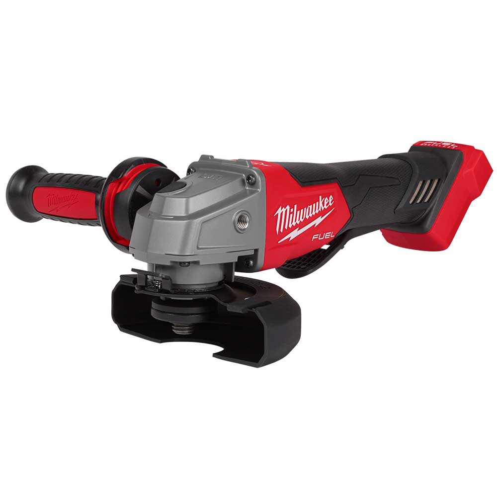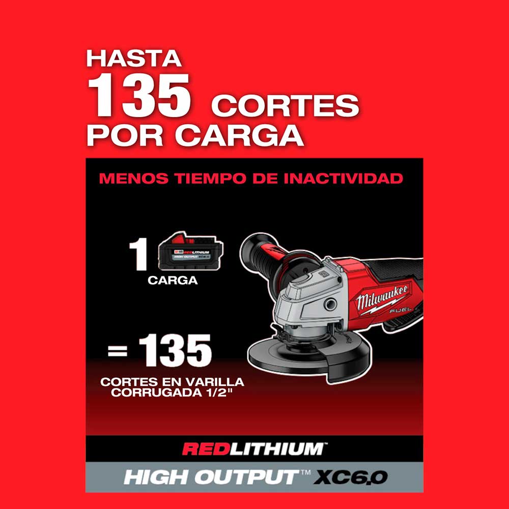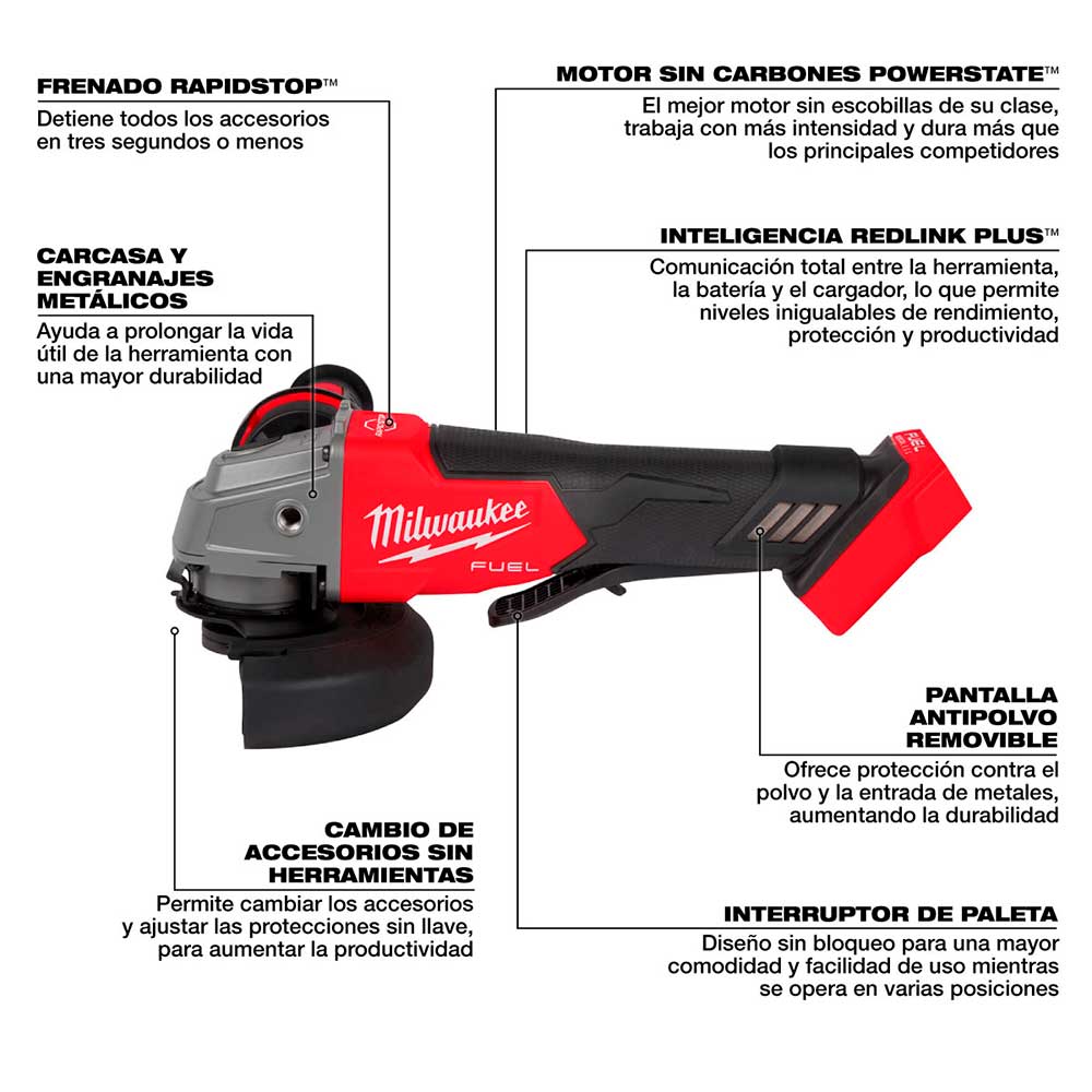 Nuestro interruptor de paleta de amoladora de 4-1 / 2 «/ 5» M18 FUEL ™, sin bloqueo es el siguiente avance en potencia y rendimiento, que genera una potencia con cable de 11 A, corta más rápido y ofrece hasta 135 cortes por carga. La amoladora M18 FUEL ™ de 4-1 / 2 «/ 5» genera una potencia con cable de 11 A que le permite completar las aplicaciones de amolado y corte más difíciles, todo en el sistema inalámbrico M18 ™. El motor sin escobillas POWERSTATE ™ ofrece máxima potencia sostenida y 8.500 RPM para eliminar material más rápido y aumentar la productividad. La inteligencia REDLINK PLUS ™ garantiza niveles inigualables de rendimiento, protección y compatibilidad. La amoladora M18 FUEL ™ 4-1 / 2 «/ 5» incluye un embrague electrónico para protección contra contragolpes, así como protección contra sobrecargas para maximizar la vida útil del motor. El M18 ™ REDLITHIUM ™ HIGH OUTPUT ™ XC6. 0 Las baterías (no incluidas) brindan un 50% más de potencia mientras funcionan un 50% más frías que nuestras baterías M18 ™ REDLITHIUM ™ XC y son compatibles con más de 200 herramientas en el sistema M18 ™. Con los ajustes de protección y accesorios sin herramientas, experimentará cambios de accesorios más rápidos y menos tiempo de inactividad, mientras sigue siendo totalmente compatible con los accesorios más comunes del mercado. La amoladora MILWAUKEE® M18 FUEL ™ 4-1 / 2 «/ 5» lleva las amoladoras inalámbricas al siguiente nivel en rendimiento y tiempo de funcionamiento.